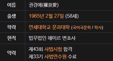 권경애 변호사는 서울 성정여자고등학교를 졸업해 연세대학교 국어국문학과 출신으로 사법시험 43기와 사법연수원 33기를 거쳐 현재 법무법인 해미르의 변호사로 활동하고 있으며 또한 민주사회를 위한 변호사 모임(민변)에 소속되어 있으며, 한미 FTA와 미디어법에 반대하였고 국가보안법 수사 중단 촉구 활동에 참여해 온 변호사 입니다.