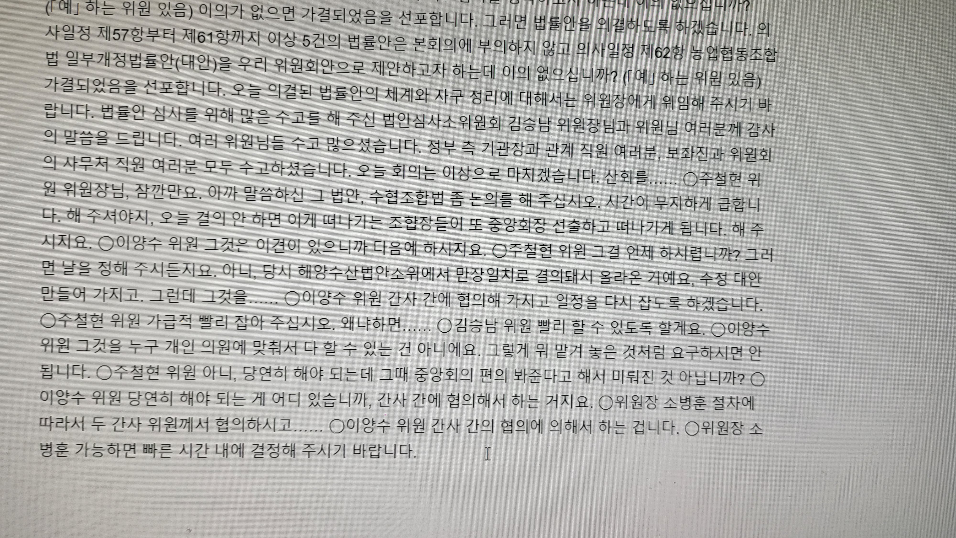 ◯위원장 소병훈 김승남 위원님 수고하셨습니다. 다음은 위원님들의 의견 개진 순서입니다. 법안소위의 심사결과에 대해서 의견이 있으시면 말씀해 주시기 바랍니다. (「없습니다」 하는 위원 있음) 더 이상 질의하실 위원님이 안 계시기 때문에 의결 절차를 시작하겠습니다. 먼저 축조심사 생략을 위한 의결을 하도록 하겠습니다. 현재 상정된 법률안에 대해서는 법안소위에서 축조심사 형식으로 논의를 하였으므로 국회법 제58조제5항에 따라 축조심사를 생략하고자 하는데 이의 없으십니까? (「예」 하는 위원 있음) 이의가 없으면 가결되었음을 선포합니다. 그러면 법률안을 의결하도록 하겠습니다. 의사일정 제57항부터 제61항까지 이상 5건의 법률안은 본회의에 부의하지 않고 의사일정 제62항 농업협동조합법 일부개정법률안(대안)을 우리 위원회안으로 제안하고자 하는데 이의 없으십니까? (「예」 하는 위원 있음) 가결되었음을 선포합니다. 오늘 의결된 법률안의 체계와 자구 정리에 대해서는 위원장에게 위임해 주시기 바랍니다. 법률안 심사를 위해 많은 수고를 해 주신 법안심사소위원회 김승남 위원장님과 위원님 여러분께 감사의 말씀을 드립니다. 여러 위원님들 수고 많으셨습니다. 정부 측 기관장과 관계 직원 여러분, 보좌진과 위원회의 사무처 직원 여러분 모두 수고하셨습니다. 오늘 회의는 이상으로 마치겠습니다. 산회를…… ◯주철현 위원 위원장님, 잠깐만요. 아까 말씀하신 그 법안, 수협조합법 좀 논의를 해 주십시오. 시간이 무지하게 급합니다. 해 주셔야지, 오늘 결의 안 하면 이게 떠나가는 조합장들이 또 중앙회장 선출하고 떠나가게 됩니다. 해 주시지요. ◯이양수 위원 그것은 이견이 있으니까 다음에 하시지요. ◯주철현 위원 그걸 언제 하시렵니까? 그러면 날을 정해 주시든지요. 아니, 당시 해양수산법안소위에서 만장일치로 결의돼서 올라온 거예요, 수정 대안 만들어 가지고. 그런데 그것을…… ◯이양수 위원 간사 간에 협의해 가지고 일정을 다시 잡도록 하겠습니다. ◯주철현 위원 가급적 빨리 잡아 주십시오. 왜냐하면…… ◯김승남 위원 빨리 할 수 있도록 할게요. ◯이양수 위원 그것을 누구 개인 의원에 맞춰서 다 할 수 있는 건 아니에요. 그렇게 뭐 맡겨 놓은 것처럼 요구하시면 안 됩니다. ◯주철현 위원 아니, 당연히 해야 되는데 그때 중앙회의 편의 봐준다고 해서 미뤄진 것 아닙니까? ◯이양수 위원 당연히 해야 되는 게 어디 있습니까, 간사 간에 협의해서 하는 거지요. ◯위원장 소병훈 절차에 따라서 두 간사 위원께서 협의하시고…… ◯이양수 위원 간사 간의 협의에 의해서 하는 겁니다. ◯위원장 소병훈 가능하면 빠른 시간 내에 결정해 주시기 바랍니다.