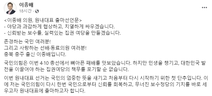 마지막으로, 이종배 의원은 "이번 원내대표 선거를 통해 국민의 신뢰를 회복하고, 당의 방향을 올바르게 이끌 수 있는 리더십을 선보이겠다"고 포부를 밝히며, 국민들의 지지를 간곡히 호소하고 있습니다.
