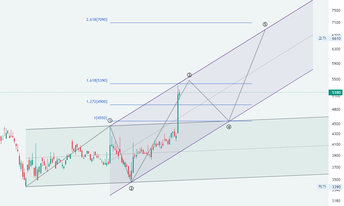 좀 더 작은 시간프레임인 일봉 차트를 보면 임펄스 3파가 종료직전으로 보입니다. 이후 4파 조정을 4450원을 깨지 않는 선에서 받고 나서 상승 5파를 보여줄 것으로 기대하고 있습니다. 앞서 말한것처럼 현재 구간은 큰3파 임펄스 구간으로 4파 조정이 예상보다 짧게 나오고 5파 상승을 연장으로 보여줄 수 도 있을거라 생각하며 그리고 세력들이 4파 조정 끝자락에서 매수할 수 있는 타이밍을 쉽게 주지않고 바로 위로 쏠수도 있는 상황을 고려하면서 매수를 해야 할 것 같습니다.