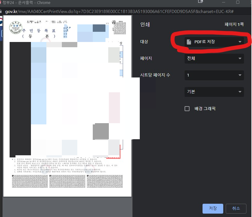 주민등록표 등본이나 초본 다른 서식들도 다 내 컴퓨터에 PDF 형태로 저장할 수 있다. 프린트로 체크되어 있는 것을 PDF저장으로 바꾸어주면 바로 내컴퓨터에 저장할 수 있다. 아주아주 쉽다.