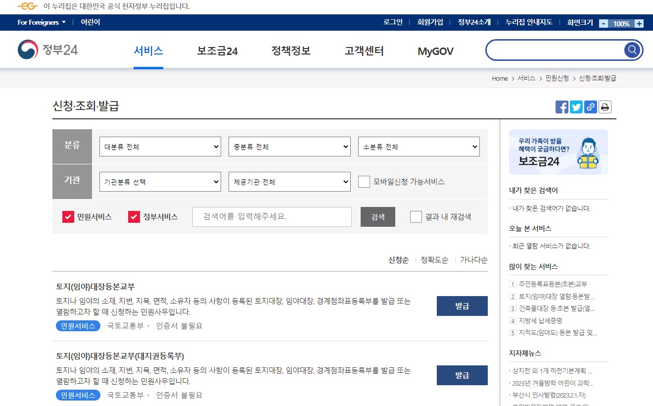 1. 먼저 정부24 홈페이지에 접속해 서비스-신청,조회,발급에 들어간다