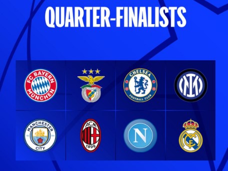 8강 진출팀은 나폴리, AC밀란, 인터밀란, 맨체스터 시티, 첼시, 레알 마드리드, 바이에른 뮌헨, 벤피카입니다.